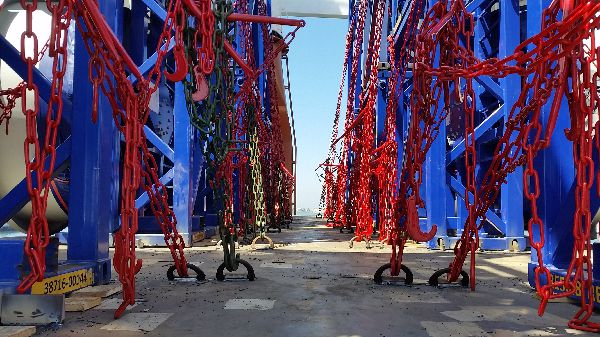 Execução de peamentos de carga em navios, contentores e/ou flats. Aplicação de correntes, cintas CORDLASH e soldaduras de olhais/stoppers